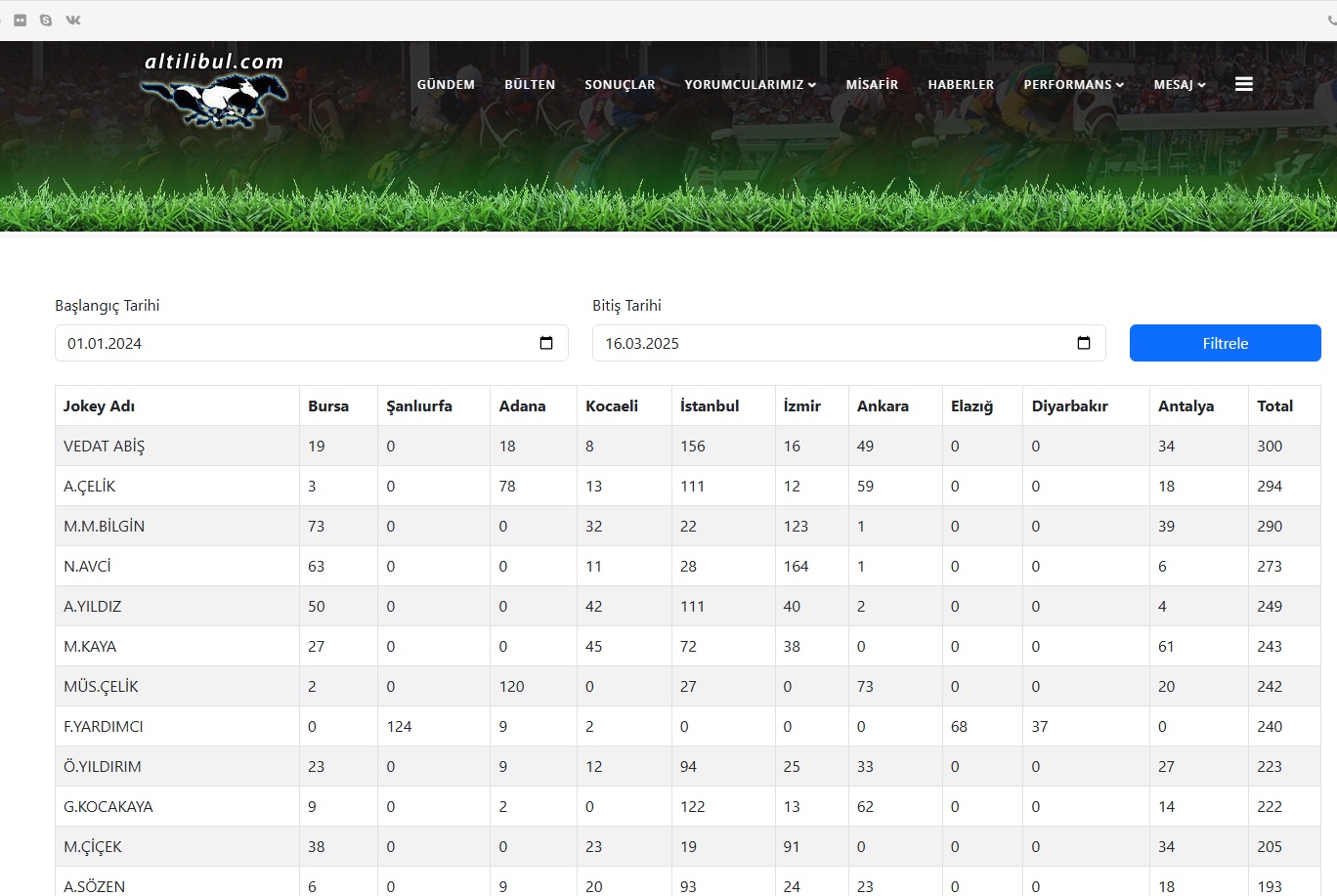 Jokeylerimizin tüm şehirlerde yarış kazanma toplamlarını gösteren tablomuzu sunuyoruz, başlangıç bitiş ve tarihi verebilirsiniz...