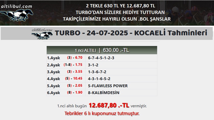 2 TEKLE 630 TL YE 12.687,80 TL TURBO'DAN SİZLERE HEDİYE TUTTURAN TAKİPÇİLERİMİZE HAYIRLI OLSUN .BOL ŞANSLAR.