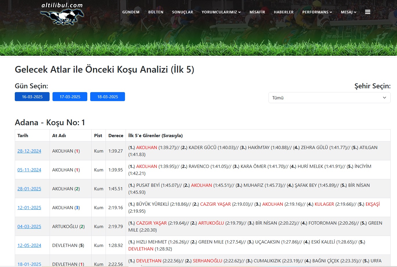 O GÜNKÜ YARIŞLARDA KİMİN KİM İLE KOŞTUĞUNUZ GÖREBİLİRSİNİZ. KİM KİMİ GEÇMİŞ .YARIŞLARINI İNCELEYEBİLİRİSİNİZ .TARİHLERE GÖRE SIRALATABİLİRSİNİZ. DERECELERİNİ, KAÇ BOY FARKLA KAZANDIKLARINI VS .LAZIM OLAN HER BİLGİYE BU SAYFADAN ULAŞABİLİRSİNİZ.
